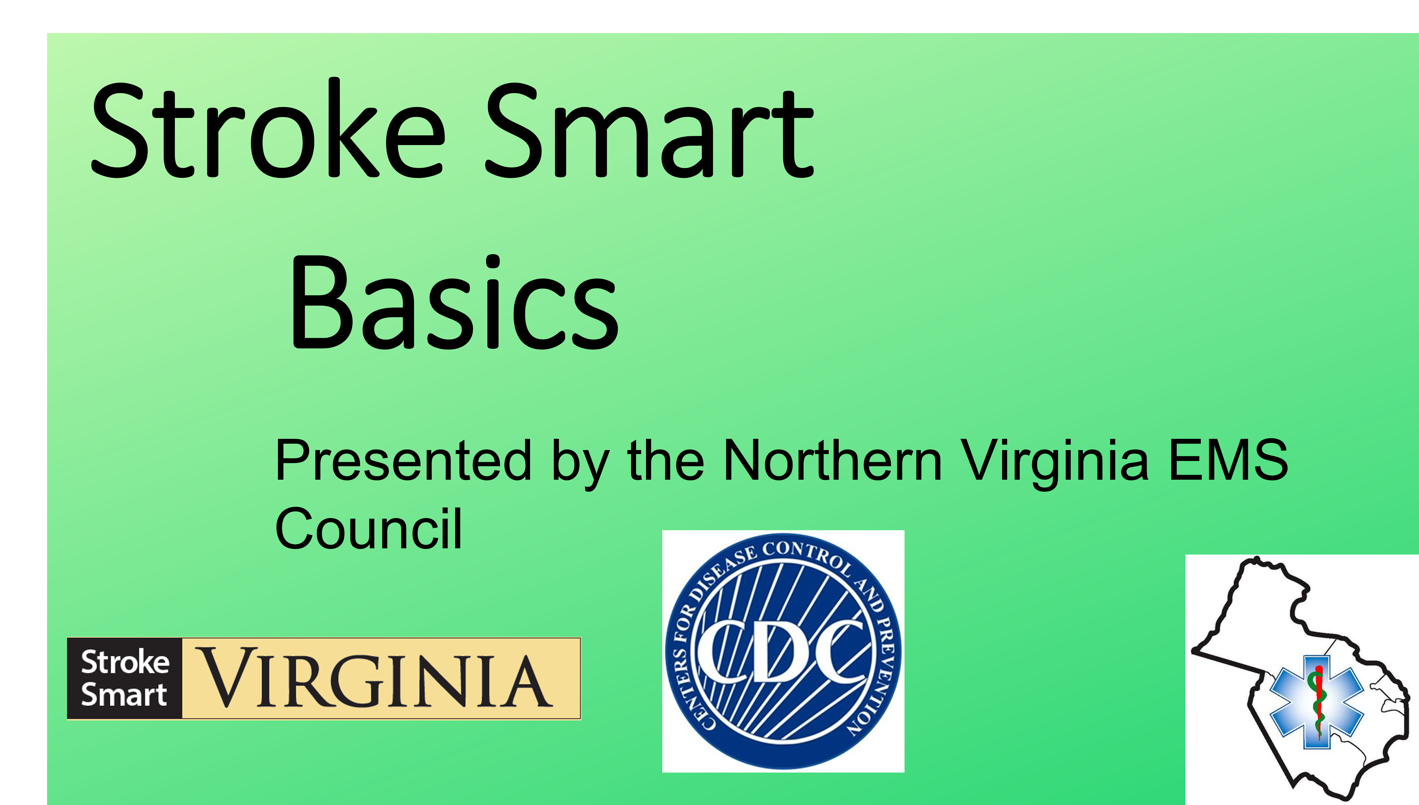 When educating an audience to be Stroke Smart, sometimes a presentation is useful. The Northern Virginia EMS Council offers this presentation to be used/modified according to your needs; click on the image to access it. Refer to the notes section of each slide for useful information.